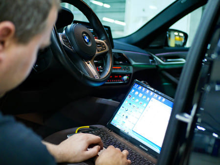 Для работы с автомобилями БМВ мы применяем фирменный диагностический сканер ICOM Next и профессиональное программное обеспечение ISTA/E-Sys. Это позволяет нашим инженерам безопасно активировать функции, такие как автоматическое закрытие багажника с ключа, запоминание режима Start-Stop, видео в движении или тонкая настройка световых сценариев.